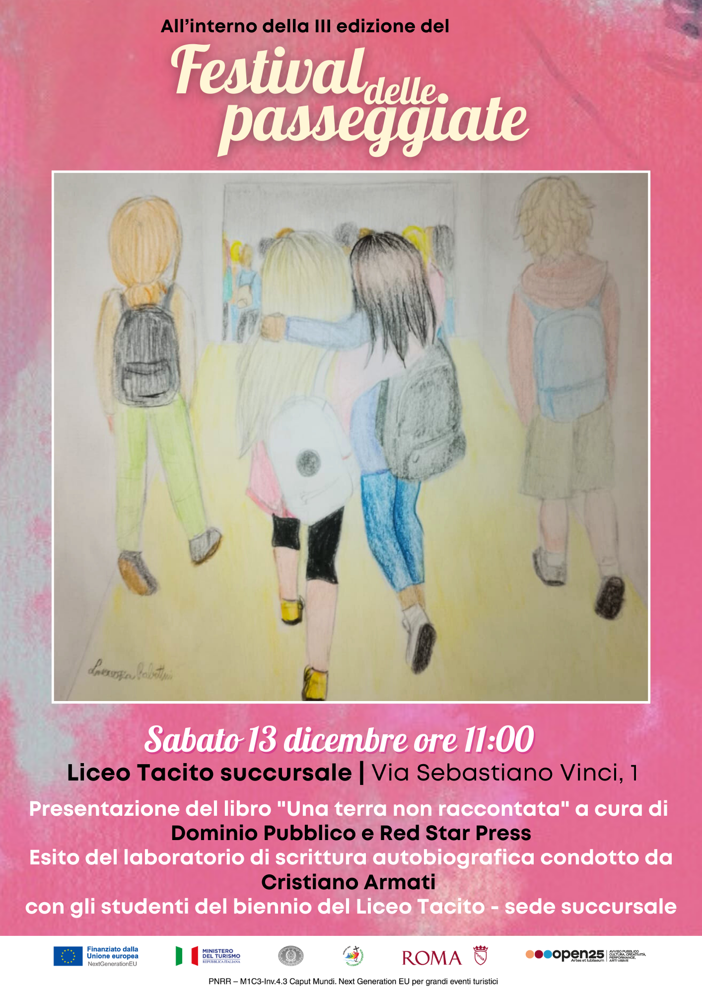 Sabato 13 dicembre alle ore 11:00, presso la sede succursale del Liceo Tacito (Via Sebastiano Vinci, 1), si terrà un appuntamento speciale all’interno della terza edizione del Festival delle Passeggiate.